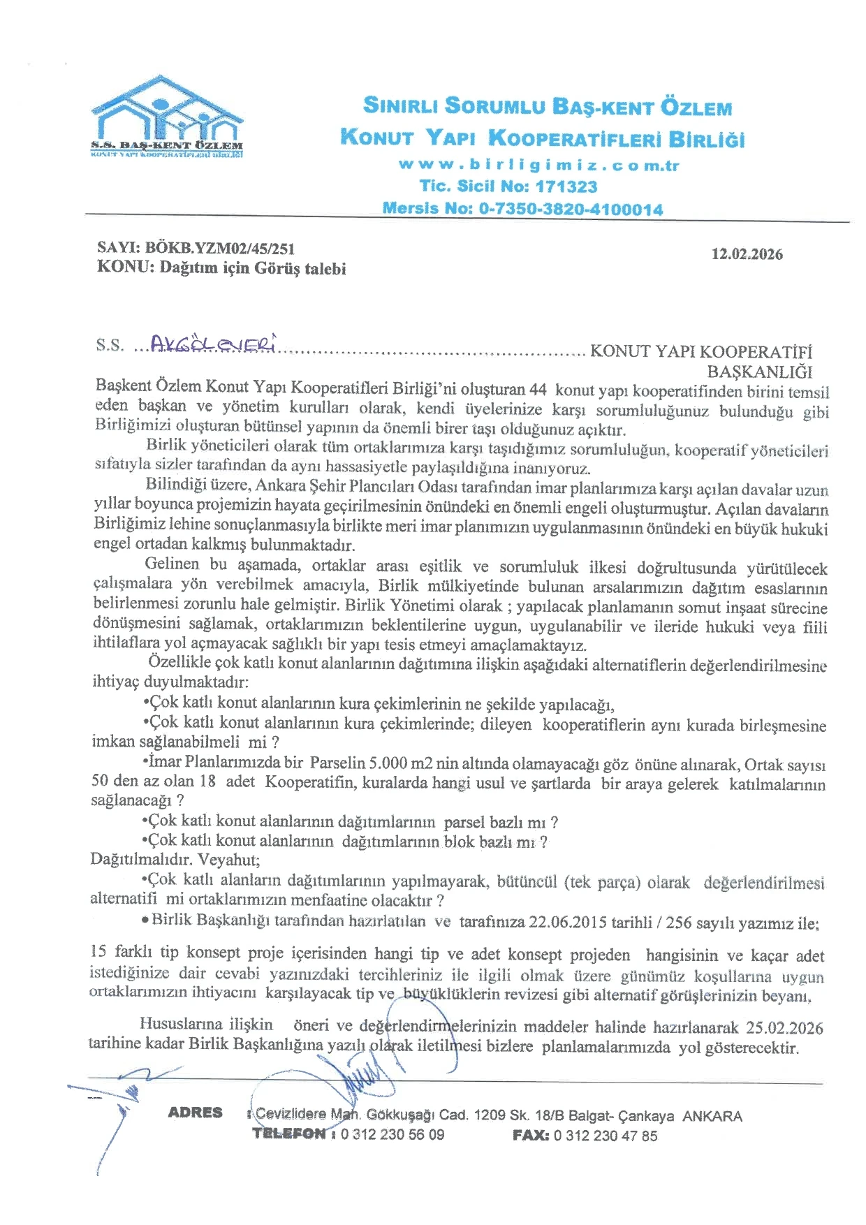 Kooperatif yönetimlerimizin, konuyla ilgili öneri ve değerlendirmelerini maddeler halinde hazırlayarak en geç 25.02.2026 tarihine kadar Birlik Başkanlığına yazılı olarak iletmeleri rica olunur.
